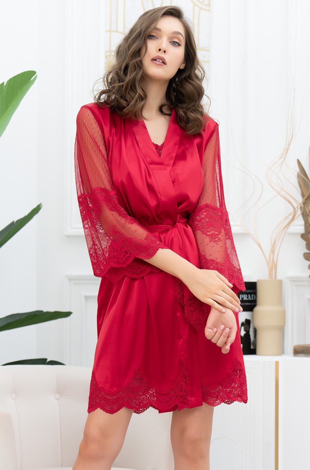 Короткий запашной халат Mia-Amore с длинными полупрозрачными рукавами. Халат выполнен из однотонного смесового шелка и декорирован ажурным кружевом, которое расположено по низу рукавов и низу изделия. По бокам обработаны карманы. Концы широкого пояса украшены кружевом.