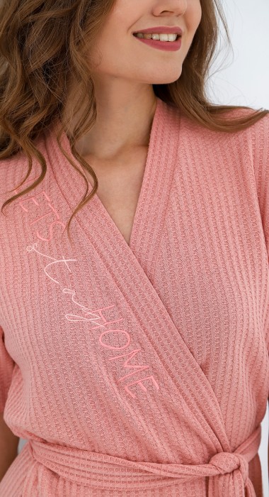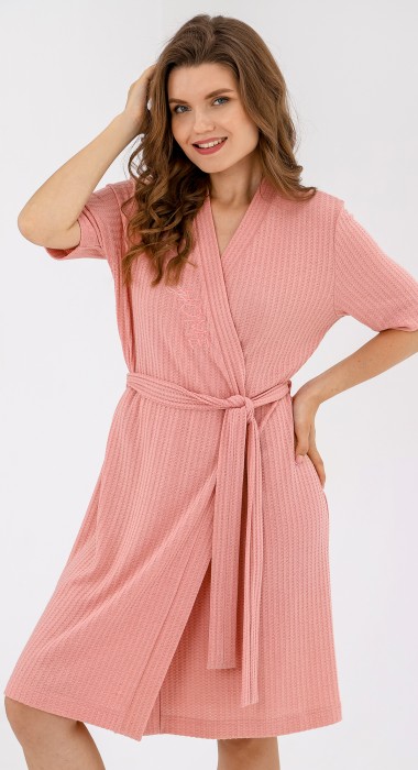 Халат молодежный из гладкокрашеного фактурного трикотажного полотна «вафля», прямого силуэта, на запахе, с короткими втачными рукавами, притачной планкой по бортам и горловине, съемным поясом, продетым через две шлевки в боковых швах на уровне талии и вышивкой на правой полочке.