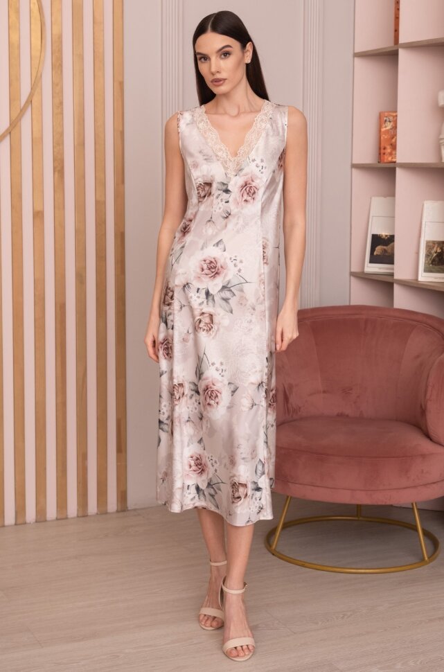 Длинная сорочка Mia-Amore с V-образным вырезом, выполнена из принтованного смесового шелка. Вырез сорочки декорирован ажурным кружевом.