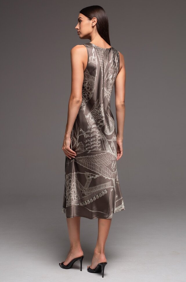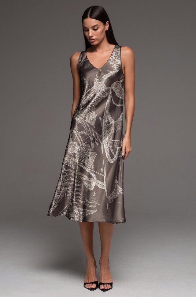 Элегантная длинная сорочка Mia-Amore на широких бретелях. Изделие выполнено из принтованного смесового шелка. По бокам расположены разрезы для свободы движения.
